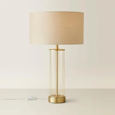 MiniSun Tube Table Lamp in a Matt Gold Metal & Transparent Finish. Complete with a Beige Drum Shade In-Line On/Off Switch. Ideal for Lounges, Hallways, Bedrooms and Other Living Areas MEASUREMENTS - Width 35cm x Height 56cm x Depth 35cm. 1 x Maximum Wattage 40w ES E27 Candle or the Equivalent LED Bulb is Required - Not Supplied Reference Number: B2909