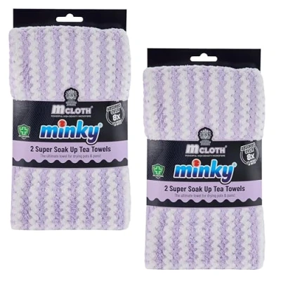 Minky Super Soak Up Tea Towels Beige Pack of 4, Ultra Absorbent, Powerful High Density Microfibre, Anti Bacterial Formulation, Hanging Tag For Easy Storage, Machine Washable (4, Lilac)