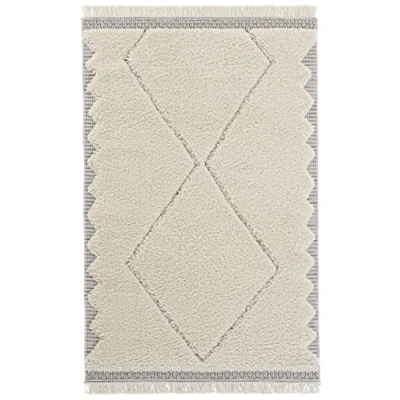 Mint Rugs Ciret High Pile Living Room Rug with Fringe, Soft Fluffy Long Shaggy Flokati Skandi Diamond Pattern for Kitchen, Hallway or Bedroom, Low Structure, Cream Grey, 80 x 150 cm