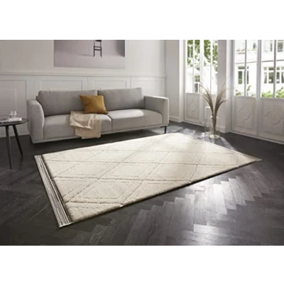 Soft and cuddly high pile rug in a modern design and high-low structure, ensures a feel-good atmosphere in any room. The modern rug is made in Europe from 100% polypropylene. Thanks to the carefully selected materials, this rug is particularly durable, robust and easy to clean; it can also be easily laid out in rooms with underfloor heating. The simple classic colours and matching stitching on the long sides of the rug complete the overall picture perfectly. Technical data: material: 100% PP; total height: approx. 22 mm; total weight: 2250 g/m²; country of origin: Belgium Box contents: Mint Rugs Design Colin shaggy rug (80 x 150 cm, high-low look, 100% polypropylene, soft, durable and easy to clean, ideal for living room, bedroom or study) cream