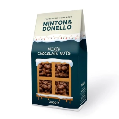 Premium Mixed Nuts: A delicious assortment of crunchy nuts coated in smooth, creamy milk and rich dark chocolate Festive Gift Packaging: Comes in a beautifully designed festive cottage-style box, making it an ideal Christmas gift, stocking filler, or hamper addition Perfect Sharing Snack: Great for family gatherings, parties, or cozy nights in Versatile Indulgence: Enjoy straight from the bag, pair with drinks, or add to dessert platters for a festive touch Premium Quality: Made with high-quality ingredients for an indulgent snacking experience you can trust