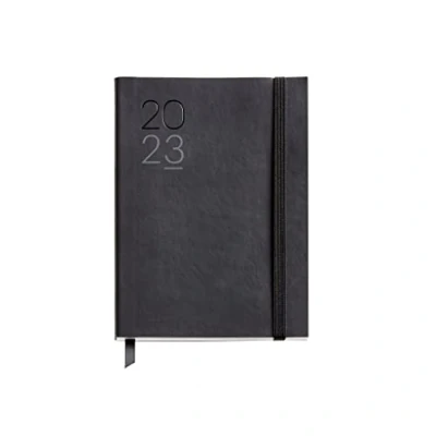 Annual Agenda 2023 Week Horizontal View (January 2023 - December 2023) Size to wear, Journal 168 x 122 mm (similar A6). Agenda language: Spanish, English and Portuguese. Contains: annuity week at horizontal view, personal data sheet, calendar 2 years, monthly planning, monthly calendar on each double page. Includes: holidays Spain and Portugal. Icons: time change, start seasons, Chinese new year, carnival and star rain (among others). Notes sheets, direction sheets. 70 g/m² matt white paper. Ribbon to point the current date and elastic closure Flexible cover with imitation leather finish (polyurethane), engraved year and serigraphy. Stitched binding with marker tape.