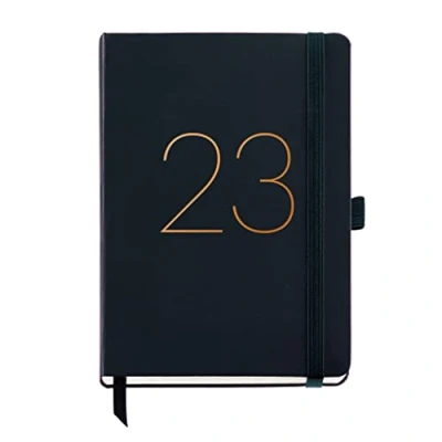 2023 Day Per Page Year Planner (January 2023, December 2023) Desktop Size, Plus 155 x 213mm (Similar A5), Language Diary, Spanish, English and Portuguese Annuity day per page (Saturday and Sunday in full page), calendars 3 years, bi-monthly calendar on each double page, recommendations, dates to remember, monthly planning Holidays Spain and Portugal, Icons, Time Change, Start Seasons, Chinese New Year, Carnival, Starry Shower, Note Sheets, Address Sheets and Personal Data Sheet 70gsm White Co-Matt Paper, Current Date Tape Padded hard cover with imitation leather finish (vinyl paper) year stamped and sewn binding, diary with inner pocket, elastic closure and rubber pen holder