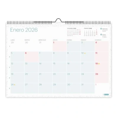 2026 WALL CALENDAR 12 MONTHS (JANUARY 2026 - DECEMBER 2026) WITH DOUBLE SPIRAL AND HANGING PIECE. With soft colors and a cheerful design, it is ideal for bringing life to your room or study area. 2026 PLANNER with clear design and space to write. Includes previous and post-month display on each page. INCLUDES sticker sheet, complete annual calendar, national and regional holidays, onomastics, moon phases and planning 2027. A3 calendar 420 x 296 mm on 140 g/m² FSC paper. A wide format that allows you to see everything at a glance without sacrificing style. DISCOVER THE 2026 Miquelrius CALENDAR that combines functionality and pastel design to accompany you throughout the year with beautiful and practical organization.