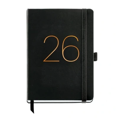 CLEAR AND FUNCTIONAL WEEKLY VIEW 2026 diary week view with horizontal distribution from Monday to Sunday. Ideal for organizing visually and effectively. Plus size 155 x 213 mm. Expanded A5 diary with 80 g/m² FSC certified paper, comfortable to write and carry on a daily basis. Complete and functional content: includes monthly planning, calendars, notes and address sheets, icons of events and holidays Catalonia, its provincial capitals and Spain. FUNCTIONAL AND DURABLE FINISHING. Sewn binding with ribbon marker, elastic band, pen holder and inner pocket. Thoughtful details for everyday use. PROFESSIONAL DESIGN AND CARE Black imitation leather cover with coordinated rubber, inner pocket, marker ribbon and copper stamping details. Trilingual interior content: Catalan, English and Portuguese.