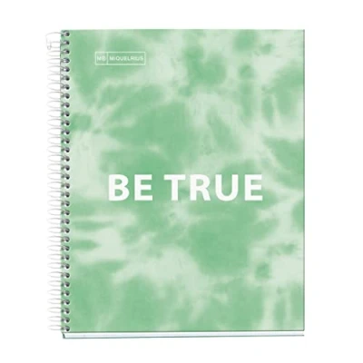 Small A5 (148 x 210mm) spiral notebook with hard cover and paper with horizontal 7mm lining. White sheets with outer and inner margin in 4 colours, allowing easy division by subject or subject in the same spiral notebook. 120 sheets of high quality paper with extra high coverage. The high weight of 90 g/m² prevents ink or ink from showing through and is perfect for use on both sides. Micro-perforated sheets for easy separation and 2-hole punched for filing in a binder. 4 pastel colours (pink, purple, blue and green) with 30 sheets per colour. Each sheet is equipped with a page margin, a header for headings and lines in one of the four colours. High quality colour printing for easy writing and reading. Cover made of extra stiff, matt laminated, laminated cardboard that serves as a desk mat. The Coilock spiral prevents snagging and allows for flat striking. Faded green design with "Be True" lettering. Made from sustainable paper with FSC MIX CREDIT certification, which guarantees that the paper comes from ecologically sustainable forests. Made in Spain.
