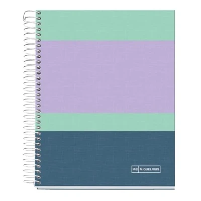 Miquelrius A5 notebook, 140 sheets of 70 g/m², horizontal ruled 7 mm, 4 coloured stripes, 2 drills, hard cover, Rider Purple collection
