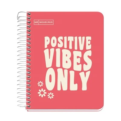 STRIPED NOTEBOOK with 100 no-drill sheets with a single color side that matches the cover. The sheets are micro-perforated, making it easy to tear off and clean peel when needed. In addition, it features a header designed especially for titles, thus providing a complete and practical solution for your writing and organizing needs. Coral coloured cover with the motivational phrase "Positive vibes only". THE INSIDE STRIPING of this notebook is horizontal, with a spacing of 7 mm between the lines, and has a header specially designed for titles, which facilitates the organization and identification of sections within the notebook. The high-quality offset printing technique used ensures greater subtlety and cleanliness in the lines, which highlights the quality of writing and facilitates reading. EXTRA OPAQUE PAPER sustainable 90gsm A6 size (105 x 148mm). The exceptional quality of this paper not only ensures a smooth writing surface, but also prevents ink bleed-through, providing clean, readable writing on both sides of the sheet. In addition, its quick-dry ability not only prevents ink smearing, but also minimizes the chance of ink diffusing across the sheet. HARD COVER NOTEBOOK made of extra-rigid cardboard that has been carefully lined and laminated in matte finish, providing durability and protection to the notebook. Continuous spiral with COIL-LOCK system that facilitates the total opening of the notebook flat, allowing you to write comfortably anywhere on the sheet without interfering with the binding. In addition, it makes it possible to turn the notebook completely without the risk of snags. 🌳 SHEETS MADE WITH SUSTAINABLE PAPER🌳 which means they contribute to the preservation of the environment. It is FSC Mix Credit certified which ensures that the material used comes from sustainably managed forests. In addition, it is important to note that this notebook is manufactured in Spain.