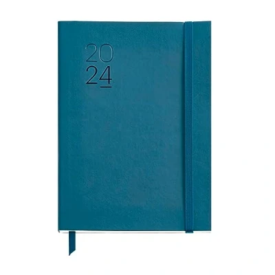 2024 Year Planner Day by Page (January 2024 - December 2024). Desktop size: Plus 155 x 213 mm (similar A5). Languages agenda: Catalan, English and Portuguese. Contains: annuity day per page (Saturday and Sunday in full page), calendars 3 years, bi-monthly calendar on each double page, recommendations, dates to remember, monthly planning. Includes: Festivities of Catalonia and its provincial capitals, Spain and Portugal. Icons: time change, start seasons, Chinese new year. Note sheets, address sheets and personal data sheet. Extra opaque 70gsm FSC Mix Credit paper ensures that the paper comes from environmentally sustainable forests. Sheets with micro-perforated corners to indicate the current date. Blue imitation leather (polyurethane) cover with elastic closure. Year engraving and screen printing. Flexible binding with ribbon marker.