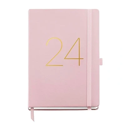 Miquelrius Annual Planner 2024, Day Page, Plus Size 155 x 213 mm (similar A5), Stitched Leather Hard Cover, Elastic Rubber, Catalan, English and Portuguese, Pink