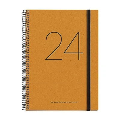 Recycled Yearly Planner 2024 Week to View Vertical (January 2024 - December 2024). Desktop size: Plus 155 x 213 mm (similar A5). Diary language: Spanish, English and Portuguese. Contains: annuity week to view vertically, calendars 3 years, bi-monthly calendar on each double page, recommendations, dates to remember, monthly planning. Includes: Spain and Portugal holidays. Icons: time change, start seasons, Chinese new year, carnival, starfall. Note sheets, address sheets and personal data sheet. 100% recycled post-consumer 70gsm paper with Blue Angel and EU Label certificate, minimizing environmental impact. Sheets with micro-perforated corners to indicate the current date. 100% recycled cardboard cover with elastic closure and screen printed year. Spiral binding allows you to open the diary flat and turn around completely.