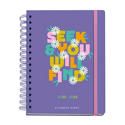 Curso School Diary 2022-2023, September 2022 to August 2023 (12 months). Season Week to View Languages: Multilingual calendar: English, Spanish, Portuguese, Italian, French, German. Cover Elizabeth Olwen, Seek & Find Includes: personal information, school calendar, quarterly timetable, healthy habits, priority list and reminder appointments, to-do list and space for notes, 2 sticker sheets. Different designs per month and week. Sheet size: approx. 155mm x 213mm A5 Paper: 90 g extra opaque. Prevents ink bleed through thanks to the quick drying and also prevents irradiation. Micro-perforated corners for easy access to the current week Lid made of coated and matte cardboard. Compact and durable. Double metal spiral. Allows you to open the planner and flip the calendar completely and with COILOCK closure to prevent snagging. Elastic band closure. Beautiful journal by Elizabeth Olwen with cheerful and colourful illustrations on the cover and inside. Agenda in 6 languages with space for notes, lists and extras such as control of healthy habits or stickers to decorate.