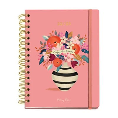 Curso School Diary 2022-2023, September 2022 to December 2023 (16 months). Season Week to View Languages: Multilingual calendar: English, Spanish, Portuguese, Italian, French, German. Peony Rose Stripes Flower Cover Sheet Includes: personal information, school calendar, quarterly timetable, monthly habits, priority list and reminder appointments, to-do list and space for notes, 2 sticker sheets. Different designs per month and week. Sheet size: approx. 155mm x 213mm A5 Paper: 90 g extra opaque. Prevents ink bleed through thanks to the quick drying and also prevents irradiation. Micro-perforated corners for easy access to the current week Lid made of coated and matte cardboard. Compact and durable. Double Gold Plated Metal Allows you to open the planner and flip the calendar completely and with COILOCK closure to prevent snagging. Elastic band closure. Beautiful peony rose design agenda with floral illustrations on the cover and beginning of the month. Agenda in 6 languages with space for notes, lists and extras such as control of healthy habits or stickers to decorate.