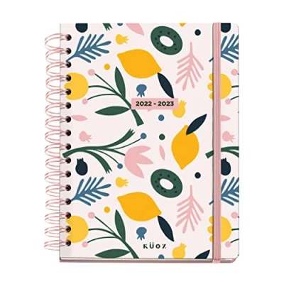 Curso School Diary 2022-2023, September 2022 to August 2023 (12 months). Season Week to View Languages: Multilingual calendar: English, Spanish, Portuguese, Italian, French, German. Cover Design Küoz, Lemon Spring Includes: personal information, school calendar, quarterly timetable, monthly habits, priority list and reminder appointments, to-do list and space for notes, 2 sticker sheets. Different designs per month and week. Sheet size: approx. 155mm x 213mm A5 Paper: 90 g extra opaque. Prevents ink bleed through thanks to the quick drying and also prevents irradiation. Micro-perforated corners for easy access to the current week Lid made of coated and matte cardboard. Compact and durable. Double metal spiral in pink. Allows you to open the planner and flip the calendar completely and with COILOCK closure to prevent snagging. Elastic band closure. Beautiful Küoz calendar with colourful illustrations of everyday life on the envelope and inside. Agenda in 6 languages with space for notes, lists and extras such as control of healthy habits or stickers to decorate.