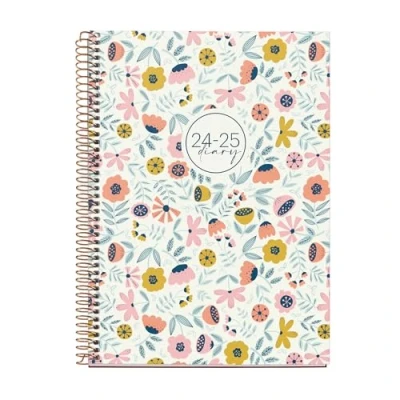 18 MONTHS SCHOOL AGENDA from July 2024 to December 2025. Annuity week horizontal view. The cover features a floral design in soft tones and colors that create perfect visual harmony 2024-2025 SCHOOL DIARY CONTAINS: Personal data, calendar 3 years, recommendations, monthly planning, dates to remember and a space for notes 24-25 COURSE AGENDA with a comprehensive trilingual approach, offering content in three languages: Spanish, English and Portuguese 2024 2025 DIARY - Similar size A5 (155 x 213 mm). FSC Mix Credit extra opaque 80gsm paper ensures the paper comes from environmentally sustainable forests Rigid cardboard cover. Lined and laminated matt. Spiral binding allows you to open the diary flat and turn around completely