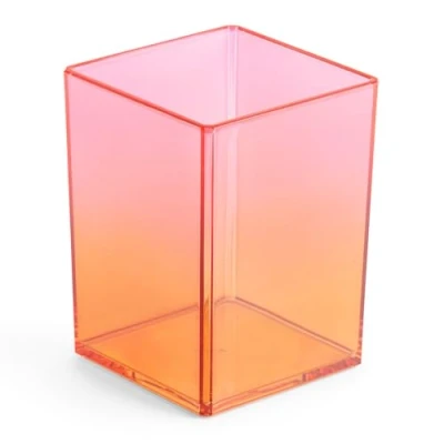 MODERN DESK CUBE Clear polystyrene with orange-red gradient finish. VERSATILE PENCIL HOLDER - Keep pens, pencils, brushes or small utensils tidy. FUNCTIONAL SIZE - Measures 75 x 101 x 75mm, designed to take up little desk space. STURDY & FUNCTIONAL Solid polystyrene offers durability and long time use. PVC Presentation Box Ideal as a gift or to keep the pen holder in perfect condition.