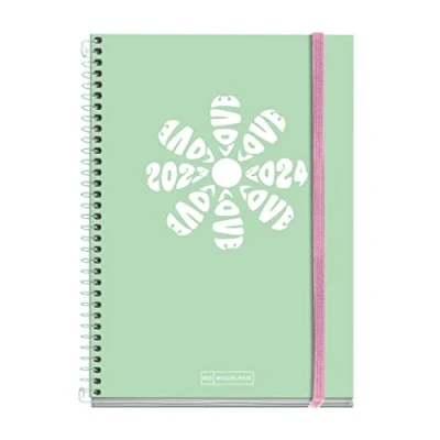 SCHOOL AGENDA, COURSE 2023 - 2024, September 2023 to June 2024 (10 months) + July and August 2024 in two weeks at sight. Annuity DAY PAGE. Language agenda completely bilingual, Spanish and English. Mint green cover with flower design. CONTAINS: Personal Data, Course Calendar, Quarterly Schedule, Monthly Planning, Tracking Exams and Jobs, Recommendations, World Map, Family/School Communication, English verbal forms and irregular verbs, Notes, 2 sheets of stickers. Blade size: 150 x 213 mm. PAPER: 70 g Extra Opaco. It prevents ink from passing through thanks to its quick drying and also curbs its irradiation. Micro-perforated corners for easy access to the current week Sheaths made of sheathed cardboard and glossy plasticized. Compact and sturdy. White metallic spiral. It allows the opening in the plane of the agenda, in addition to turning completely and with closure that prevents snags. Closure with elastic band. Agenda made with FSC MIX CREDIT certified SUSTAINABLE paper ensuring paper comes from environmentally sustainable forests.