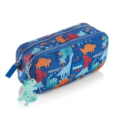 School laptop for back to school with dinosaur print in bright colors on a blue background and front patch with message. Includes a dinosaur keychain that makes it even more fun to carry school supplies DOUBLE CASE CONFORM FOR DAILY SCHOOL USE Two zippered compartments to store pencils, markers, rubber, ruler and more, all organized and accessible 🐾️ CASE MADE WITH RECYCLED MATERIAL ♻️ Made with recycled polyester (RPET) and polyester inner lining, ideal for those looking for a sustainable and resistant option Rectangular size and comfortable to carry. Dimensions: 110 x 230 x 60 mm. Compact and practical, easily fits into any school bag 「DINO COLLECTION」 Fun and colorful, featuring dinosaur print and embossed letters, includes matching keychain to complete the most Jurassic back to school look