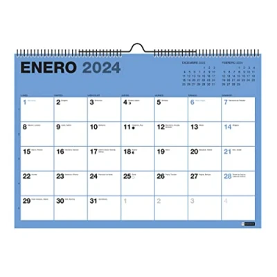 18 MONTHS WALL CALENDAR (July 2023 - December 2024) each month one color. Calendar with double spiral box and hanging piece. Daily boxes with space to jot down events and reminders. MONTH BY PAGE DISPLAY AND PREVIOUS MONTH AND LATER MONTH REMINDER. CONTAINS: National holidays, regional and provincial capitals, annual calendar, monthly plan 2024, notes, onomastics and moon phases. Size A3, 420 x 297 mm. 120g FSC MIX CREDIT heavyweight paper, which guarantees that the paper comes from environmentally sustainable forests. Complete and practical 18 month calendar for years 2023 and 2024 in grey tones to hang on the wall. Includes space for noting, holidays, name and moon phases.