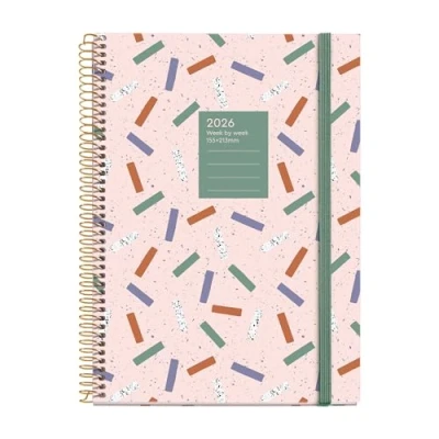 COLORFUL DESIGN Cover with multicolor confetti print on light background, cheerful and modern, perfect for planning every day in style. WEEKLY ORGANIZATION (January to December 2026), Spanish language, includes national holidays and ample space to organize tasks. A5+ Format 155 x 213 mm, comfortable for desk and perfect to carry in handbag or backpack without taking up too much space. Carefully crafted materials: Sturdy cover made of matt laminated cardboard, practical spiral binding and FSC ivory paper with a pleasant feel. FUNCTIONAL EXTRAS Elastic band, micro-perforated sheets, calendars, monthly planning, space for notes, addresses and useful icons.