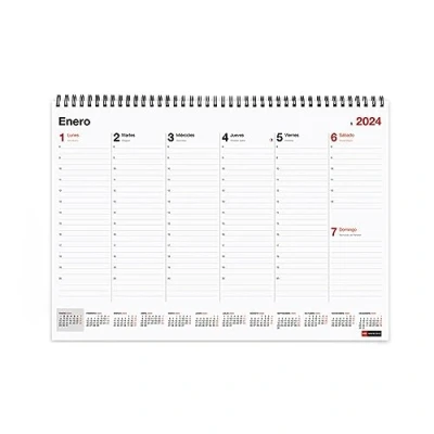 2024 Weekly Planner, 12 Months (January 2024 - December 2024) with Twin Spiral Binding. Planner week view vertical with hours: from 8:00 to 20:00. Monday to Friday in full column, Saturday and Sunday in a single column. Full year view and outstanding month in progress. Contents: annual calendar at the foot of each week. National and regional and provincial capital holidays. Time change. Moon and onomastic phases. Size 420 x 296 mm (A3). 100 g/m² FSC Mix Credit paper guarantees that the paper comes from environmentally sustainable forests. 2024 Weekly Spiral Desktop Planning Plan the week in detail and have all the appointments at hand at your desk.