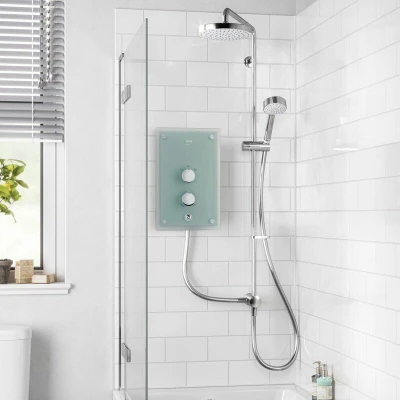 Mira Azora Dual Thermostatic Electric Shower - Frosted Glass - 9.8kW - 1.1634.156. Add a touch of style to your bathroom… and enjoy more luxury in life. This chic, modernist shower has a convenient handset plus an indulgent 200mm deluge head, combined with safe thermostatic technology. Choose and divert between a convenient handset and luxurious 200mm deluge head for a more indulgent shower. Easy to clean heads and hoses make keeping your shower in top condition quick and simple. Eco setting means you can save both power and water for showering that’s kinder to the planet. You can position the deluge overhead where it suits in your bathroom, thanks to the adjustable arm. The Mira Clearscale™ technology reduces limescale by up to 50% to keep your shower working better and for longer. Mira Sensi-flo™ technology protects you against sudden surges of hot water if there is ever a blockage in your showerhead or hose that suddenly clears Easy on/off button. Plus separate power and temperature controls make using your shower seamless. Control type: Thermostatic SMA Phased shutdown: Yes Factory set to safe max temp: Yes, Factory set at 48°C Supply Voltage: 230v + 10% Supply rating 45 amp Terminal block connections: Maximum 16mm² Water entry points: Left (Rising, falling or rear with an elbow) Cable entry points: Left (Rising, falling or rear) Inlet connections: Brass inlet connector. 15mm compression fitting Outlet connections: 1/2" BSP Male Minimum maintained pressure: 0.7 bar (7 metre head) Maximum maintained pressure: 5.0 bar (50 meter head) Maximum static pressure: 10.0 bar (100 metre head) Energy Efficiency: Class A Part of the Mira Cashback offer. For details click here. Genuine brand new Mira product, covered by a Mira manufacturer's guarantee.