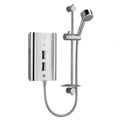 Mira Escape Thermostatic Electric Shower 9.0kW - Chrome (1.1563.730). Thermostatic temperature stability keeps showering safe for all the family. Maximum temperature stop for increased safety. Separate power and temperature/flow controls to fine tune your perfect shower. Push button on/off so you can leave the power and temperature controls at your preferred setting. Mira Sensi-flo™ technology helps prevent scalding if the shower head or shower hose become blocked. Phased shutdown flushes hot water from the tank at the end of each use to make it safe for the next user. Mira Clearscale™ technology cuts limescale by half for a better performing, longer lasting shower. Includes 4 spray shower head, with rub-clean nozzles for easy limescale removal. Also includes shower head holder, shower hose, hose retaining ring, soap dish, and riser rail. Suitable for cold mains water systems only. Minimum maintained pressure 0.7 bar. Maximum maintained pressure 5.0 bar. Maximum static pressure 10.0 bar. All chrome finish, with a slim line design. 2 years manufacturer's guarantee. Installation guide included. Energy efficiency class A. WRAS and BEAB approved. Genuine brand new Mira product, covered by a Mira manufacturer's guarantee.