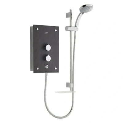 Mira Galena Thermostatic Electric Shower 9.8kW - Slate Effect (1.1634.117). Thermostatic temperature stability keeps showering safe for all the family. Separate power and temperature controls to fine tune your perfect shower. Push button on/off so you can leave the power and temperature controls at your preferred setting. Mira Sensi-flo™ technology helps prevent scalding if the shower head or shower hose become blocked. Mira Clearscale™ technology cuts limescale by half for a better performing, longer lasting shower. Includes 5 spray shower head, with rub-clean nozzles for easy limescale removal. Also includes shower head holder, shower hose, soap dish, and riser rail. Suitable for cold mains water systems only. Minimum maintained pressure 0.7 bar. Maximum maintained pressure 5.0 bar. Maximum static pressure 10.0 bar. Unique slate effect fascia finish, with chrome fittings. 2 years manufacturer's guarantee. Installation guide included. Energy efficiency class A. WRAS approved. @C3bwxoAtq2E@ Genuine brand new Mira product, covered by a Mira manufacturer's guarantee.