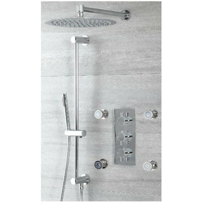 Mirage Modern 3 Outlet Triple Thermostatic Mixer Shower Valve with Wall Mounted 300mm Round Rainfall Head Hand Handset Slide Rail Bar