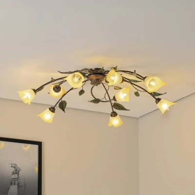 Miranda 9-bulb ceiling light: Florentine design meets European craftsmanship The Miranda ceiling light combines Florentine elegance with high-quality iron and glass workmanship. The artistically designed arms in bronze and gold lend every room a touch of class, while the opal white glass elements ensure even light distribution. This light is not only a visual highlight, but also versatile in living rooms, kitchens, hallways and dining rooms. A special feature of the Miranda is its dimmability, which is made possible by an external dimmer to individually adjust the light intensity. Manufactured in Europe, the light impresses with its robust construction and harmonious colour scheme in bronze, gold and green. The combination of traditional Florentine style and modern functionality makes the Miranda ceiling light an indispensable element of stylish interior design.