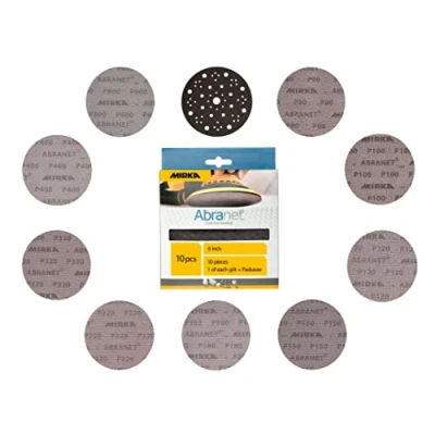 Mirka Abranet - the original dust-free sanding net disc 6 inch + Pad Saver / Ø 150mm, Mix-Pack 10 pcs, 1 of each Grit 80, 100, 120, 150, 180, 220, 320, 400, 600 + Pad Saver Application: Abranet is suitable for sanding wood, putty, varnish, primers, paint, lacquers, plastics, steel, metal and composite materials Abranet combines high performance and a long lifespan, making it a cost-effective solution Designed for dry sanding, by hand or with a machine, the woven mesh backing works with hook and loop attachment and fits to every hole pattern The true dust-free sanding characteristics prevents the inhalation of harmful dusts and minimises the cleaning effort. It results as well in a better surface finish, Weight: 0.15 Pounds, Manufacturer: Mirka
