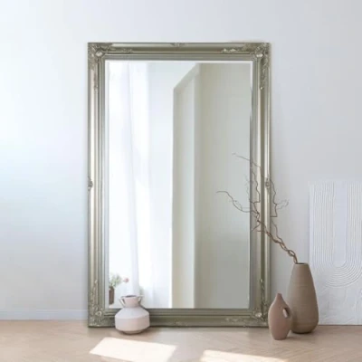 Full Length Floor standing Leaner Large Silver classical hand finished french style Antique design wall mounted mirror boasts ornate detailing in all four corners and sides and comes with premium bevelled mirror glass. This mirror has a glass size of 5ft x 3ft, 152cm x 91cm and has an overall size of 5ft7 x 3ft7, 170cm x 109cm. Classical Full Length Floor Standing Leaner Antique Style Wall Mounted Mirror Which Can Be Hung Either Portrait or Landscape. Do Not Use String to Hang This Mirror, Please Use Heavy Duty Fixings. Create a Classical Statement for your Lounge, Dining room, Bedroom or Kitchen. We stock this frame in 5 different colours white black gold silver and ivory and 5 different sizes. Explore MirrorOutlet Full Range of Venetian, Antique and Classical Full Length Leaner and Wall mounted mirrors