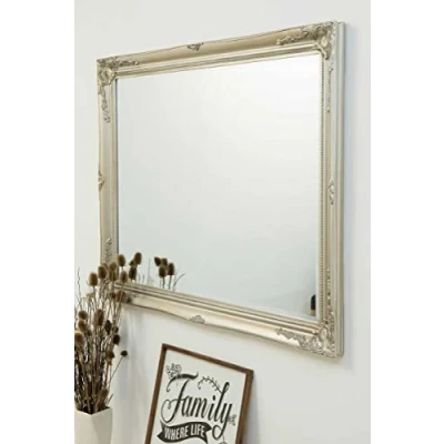 Milton Manor Large silver classical hand finished french style Antique design wall mounted mirror boasts ornate detailing in all four corners and sides and comes with premium bevelled mirror glass. This mirror has a glass size of 4ft x 3ft, 122cm x 91cm and has an overall size of 4ft7 x 3ft7, 140cm x 109cm. Classical Antique Style Wall Mirror Which Can Be Hung Either Portrait or Landscape. Do Not Use String to Hang This Mirror, Please Use Heavy Duty Fixings. Create a Classical Statement for your Lounge, Dining room, Bedroom or Kitchen. We stock this frame in 5 different colours white black gold silver and ivory and 5 different sizes. Explore MirrorOutlet Full Range of Venetian, Antique and Classical Full Length Leaner and Wall mounted mirrors Is Assembly Required: False