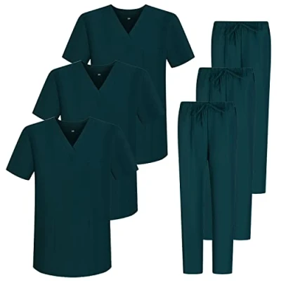 UNISEX MEDICAL SCRUBS:Nurses, doctors, surgeons, therapists, dentists -these comfortable hospital scrubs have been specially designed for you! Medical Uniform with Scrub Top and Pants - Scrubs Uniforms Set Unisex medical uniforms nurse dentists. V-NECK TOP:The top of the nurse's uniform is short-sleeved with a V-neckline, 2 roomy bottom patch pockets, and side vents for easy movement. COMFY PANTS:The drawstring scrub pants have a flat-woven dyed inseam, a back hip pocket and natural-rise tapered legs, that'swhy they're comfy! WASHABLE AND DURABLE:Thanks to their unique fabric blend (65% polyester, 35% cotton, poplin), the surgical scrubs are washable and very durable.