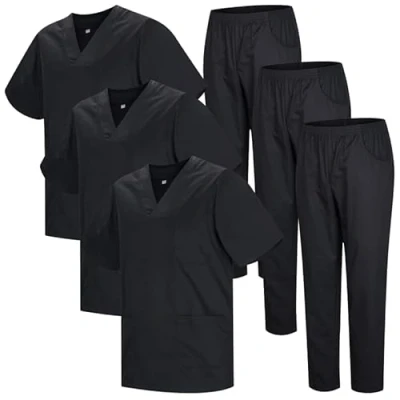 UNISEX MEDICAL SCRUBS:Nurses, doctors, surgeons, therapists, dentists -these comfortable hospital scrubs have been specially designed for you! Medical Uniform with Scrub Top and Pants - Scrubs Uniforms Set Unisex medical uniforms nurse dentists. V-NECK TOP:The top of the nurse's uniform is short-sleeved with a V-neckline, 2 roomy bottom patch pockets, and side vents for easy movement. COMFY PANTS:The drawstring scrub pants have a flat-woven dyed inseam, a back hip pocket and natural-rise tapered legs, that'swhy they're comfy! WASHABLE AND DURABLE:Thanks to their unique fabric blend (65% polyester, 35% cotton, poplin), the surgical scrubs are washable and very durable.