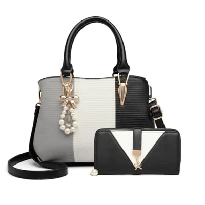 Amazon Material: The women’s handbag and purse set is made of PU leather with durable polyester lining and light gold hardware. Size: Handbag-24*10*21 cm (L*W*H), the height of top handle is 15 cm, it weights 0.9 kgs; WALLET-19.5*10*3 cm (L*W*H), it weights 0.21 kgs. Structure: This handbags for women contains 2 compartments, 2 inner zip pockets, 1 rear zip pocket, 2 open pockets; women’s purse contains 12 card slots, 1 ID window, 2 compartments and 1 zipper pocket. Fetures: Elegant and classical desiner handbags for women, 3 colour block sections design with gold coloured bow, pearl and crystal style drop. Occasions: Suitable for working, shopping, traveling wedding or daily use. Perfect to use as birthday gifts for women, girls, mom, ladies, friends or colleague.