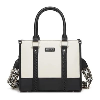 Overall Look: This top handle bag boasts a square silhouette, featuring double top handles paired with an adjustable wide shoulder strap (supporting hand-carry or crossbody wear). The front is adorned with symmetrical woven trim, adding artisanal details that elevate its appeal among handbags for women. Versatility: This casual-chic handbag for ladies is crafted from spliced PU leather, with reinforced edge rivets for durability. The wide shoulder strap, decorated with ethnic-style geometric patterns, blends fashion with shoulder pressure relief – a standout choice among shoulder bag for ladies. Dimensions: 28cm/11in (length) x 13cm/5.1in (width) x 21cm/8.2in (height); weight: 0.55kg. Detail Design: This ladies' shoulder bag featuring a top zip has a light beige upper half and white lower half. The woven trim and handles come in light brown, while the shoulder strap showcases a beige-and-brown geometric pattern. With soft tones, it leans towards a gentle, fresh everyday style. Practicality: Ideal for daily commutes, casual outings, and various occasions, these small tote bags support hand-carry, crossbody, or shoulder wear. The detachable & adjustable shoulder strap caters to different needs, striking a perfect balance between style and functionality – embodying the best of bags for women. Pocket Design: Inside, these women bags feature a large-capacity main compartment, plus an open pocket and a small zipped pouch for personal items. They easily hold all daily essentials: phone, sunglasses, headphones, tablet, cosmetics (such as eyeshadow palettes, lipsticks, etc.), living up to the practicality expected from quality handbags for women.