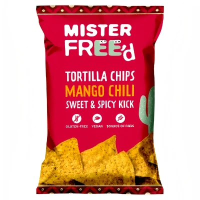Mister Free'd Organic Tortilla Chips with Mango 135g blend stone-ground corn with real mango and smoky chili for a sweet, spicy crunch. Gluten-free and vegan, these sturdy chips offer an exciting tropical twist—perfect for dipping or snacking on their own.