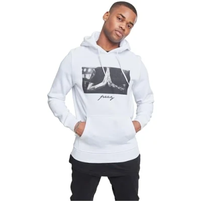 The ultimate casual wear: cozy, warm and stylish, this sweatshirt without zip features long fit and a wide kangaroo pocket, which together with the ribbed cuffs and hem round, round off the look. A heavenly statement: this monochrome men's hoodie features a large print on the chest with the wording "Pray" underneath – pair with it with jog pants for a sporty look or with cigarette jeans & boots for an underground style. Extreme comfort and high-wearing comfort: the soft cotton fleece material mix makes this streetwear jumper lightweight, whereas the hoodie can be regulated with drawstring, perfect for keeping you warm. Keep it urban and simple: you can never go wrong with this men's sweatshirt as it does not lose shape or colour and it is machine-washable (30 degrees), assuring a perfect fit for years to come. Scope of delivery: 1 x Men's Hooded Sweatshirt with Kangaroo Pocket, Sizes: XS-5XL, Colours available: Grey, Black, White, Red, Dark Grey, Yellow, Military Green, by Mister Tee.