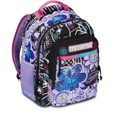 Dimensions: 30 x 20 x 43 cm; Capacity 30 litres Back: Preformed with integrated bottom; Straps: Padded and covered in fabric and mesh Pockets: 2 side mesh pockets. Large front pocket. Other features: Triple compartment backpack with sturdy backrest. Mitama's patented shoulder strap position keeps the backpack taller by fitting perfectly to the student's back, even during movement. Super shiny sequins, laminated lettering and rubberized fabrics make the backpack unique in its style Fabric: 900D resin polyester