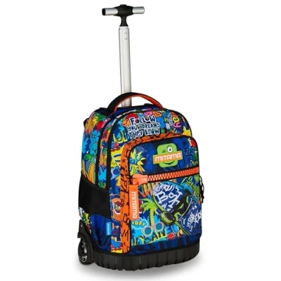 Dimensions: 46 x 21 x 34 cm; Capacity: 33 litres Back: Padded and covered in fabric; Straps: Padded and covered in fabric Pockets: Front pocket, side pocket and shoulder strap pocket. Other features: Trolley with large double compartment and telescopic handle adjustable according to the height of the child. The 7 cm diameter wheels in soft rubber allow you to cushion holes and doses on any type of path. Backpack use: thanks to its retractable Fast'n Go shoulder straps. Fabric: 900D resin polyester