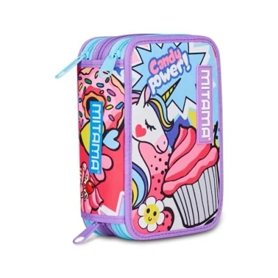 Dimensions: 20 x 14 x 7 cm Pockets: Triple compartment Inside you will find 47 pieces of school supplies: 2 GOODY erasable pens BLUE and RED, 2 HB pencils FLUO barrel, 1 TWICE highlighter, 2 FLUO ballpoint pens, 1 STRONGLUE glue, 1 FLUO eraser, 1 FLUO pencil sharpener, 1 ruler 15 cm FLUO, 18 crayons, 18 markers. Material: Polyester This triple compartment pencil case is the ideal solution for organizing everything you need for school. With its colourful design, it is designed for primary school children. Made of durable polyester fabric, this pencil case combines practicality and quality.