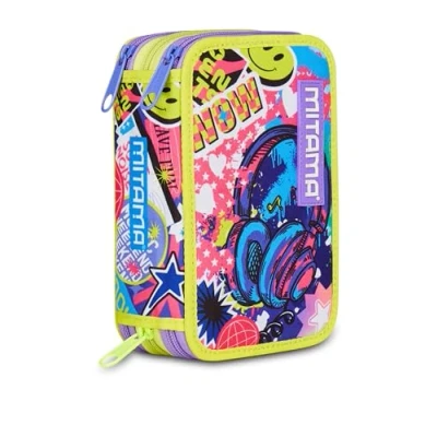 Mitama School Pencil Case 3 Compartments, Triple Music Sticker, Content 47 Pieces, Complete with Pencils, Markers and Pen Holder for Elementary Girl, Purple, Modern