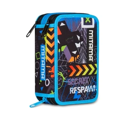Mitama Triple Cyberplay School Pencil Case with 3 Compartments, 47 Pieces, Complete Pencils, Markers, Pen Holder for Elementary Children, Black, Modern
