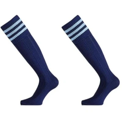 Mitre Junior Mercury 3 Stripe Football Socks Team Kit Lightweight Long Sock Breathable Sports Sock, Navy/Sky Blue, (3 UK 6 UK)