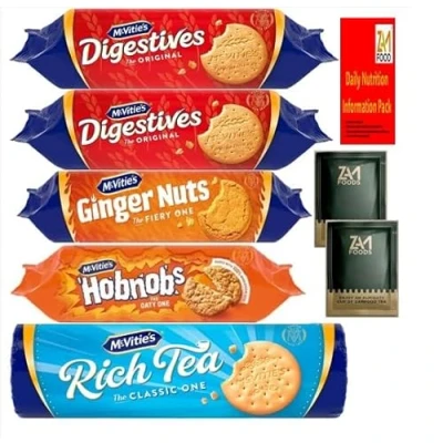 2 packs of Digestive, 1 pack of Hobnobs, 1 Pack of Ginger nut, 1 pack of Rich tea, 1 pack nutrition information pack, zamfoods tea No Artifical Colours and Flavours Suitable for Vegetarains. Mcvities biscuits and Zamfoods tea together are too good not to share. Each order consists Zamfoods Tea and Nutritions pack.