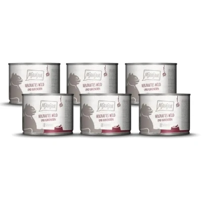 Complete wet cat food - extra high proportion of meat - essential vitamins and minerals - grain free For our meals, we mainly use ingredients that come from regional farms MjAMjAM - because it`s tasty Free from: Cereals, gluten, sugar, synthetic preservatives, lactose Ingredients: 96 % meat and offal's (48 % venison meat and 48 % rabbit meat, heart, liver, lung, kidney), 3 % blueberries, 1 % mineral nutrients