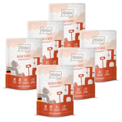 MjAMjAM Premium wet food for cats Quetschie savoury game with fruity apple, 6 pack (6x300g), grain free