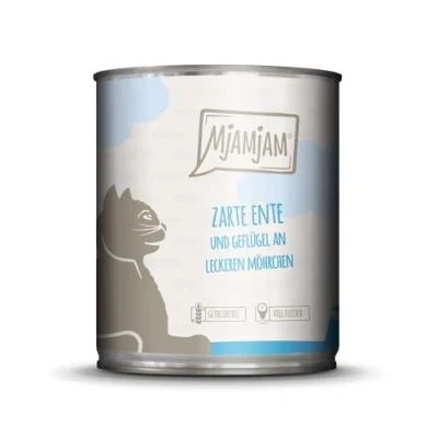 Complete wet cat food - extra high proportion of meat - essential vitamins and minerals - grain free For our meals, we mainly use ingredients that come from regional farms MjAMjAM - because it`s tasty Free from: Cereals, gluten, sugar, synthetic preservatives, lactose Ingredients: 96 % meat and offal's (38 % duck meat, heart, 31 % chicken meat, liver, gizzard, 27 % turkey meat, heart, liver), 3 % carrots, 1 % mineral nutrients