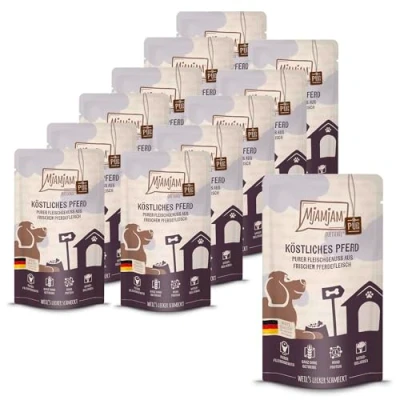 MjAMjAM Premium wet food for dogs Quetschie pure meat enjoyment delicious horse, 12 pack (12 x 125g), grain free with extra